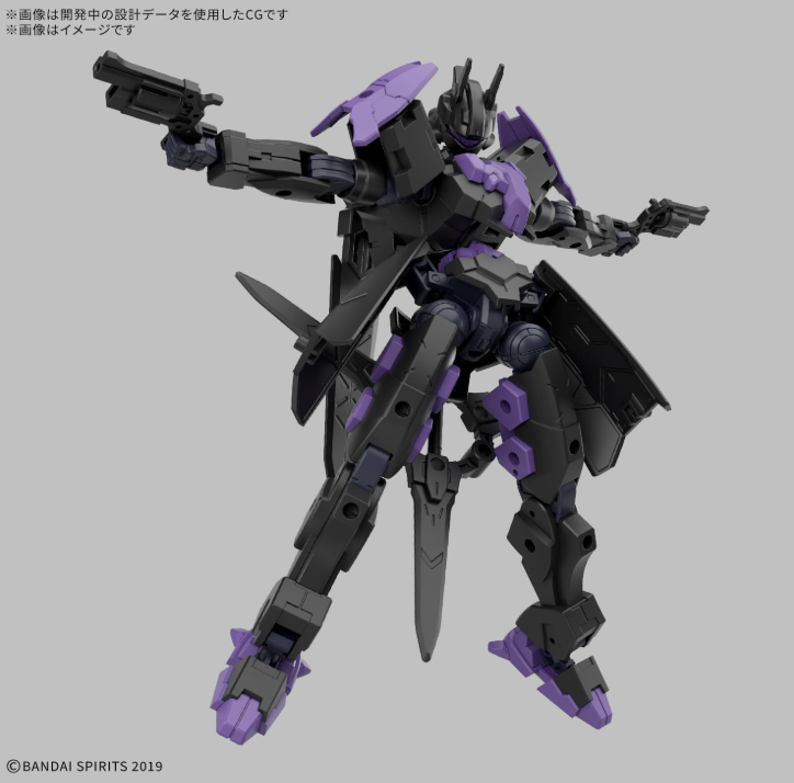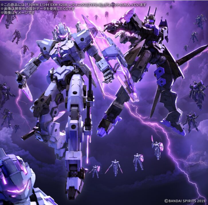 30 MINUTES MISSIONS(30MM)のマクシオン軍系統に投入された新型《EXM‑X20 レヴィニクス》は、“間合いを制する近接制圧”をテーマに設計された近接特化機です。そのバリエーションのひとつである【TYPE‑B】は、黒×紫の成形色がもたらす重厚な印象と、素体段階から成立する“二丁リボルバー+刃物系”の装備構成が最大の特徴。30MM標準の3mmジョイント規格を全身に多数搭載し、既存の武装・アーマーやエグザビークルとの高い互換性を確保しています。