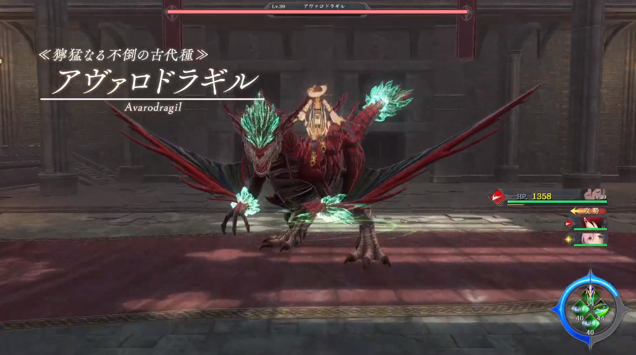 - 体力を減らすと炎を纏い、突進の回数が増えたり、滑空しながらブレスを吐いたりと攻撃のバリエーションが増える