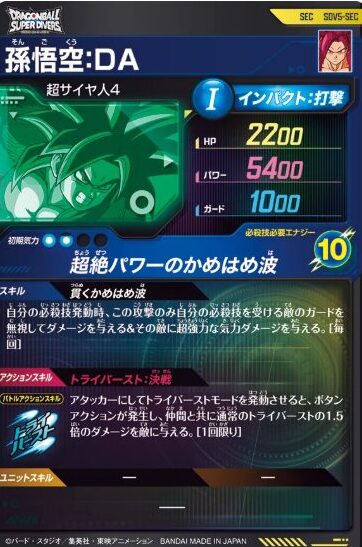 SDV5-SEC(SEC 孫悟空:DA)は、『ドラゴンボールスーパーダイバーズ』第5弾のシークレットカードです。特徴は、必殺技発動時に「ガード無視のダメージ」+「超強力な気力ダメージ」を同時に入れられる点にあります。相手がガードを上げて耐える前提でも、必殺技を通した瞬間に計算が崩れやすく、さらに気力面まで削れるので、次のラウンドの動きまで弱らせやすいのが強みです。
