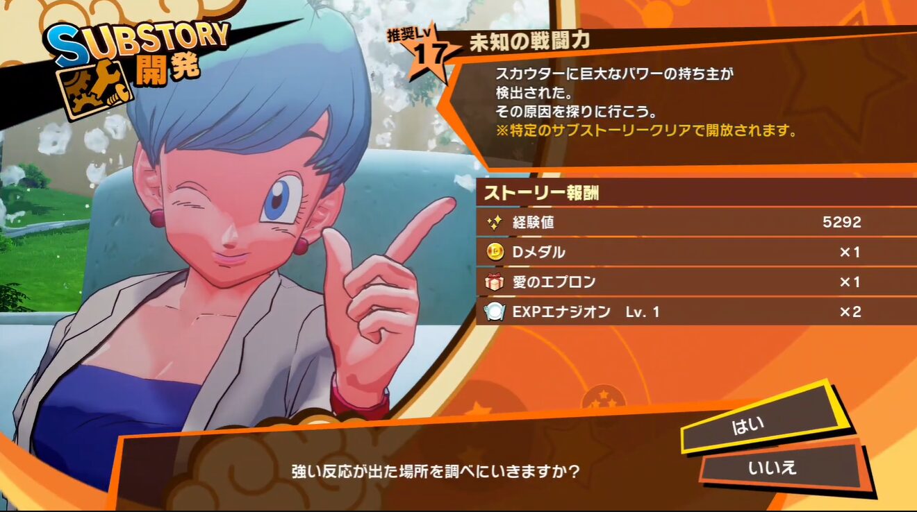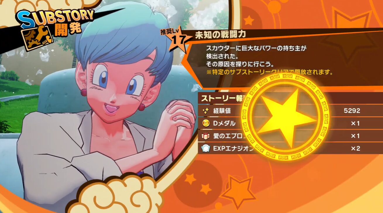 サブストーリー「未知の戦闘力」は、『ドラゴンボールZ KAKAROT』サイヤ人編・第7話インターバルに解放される序盤クエストです。受注は西の都(カプセルコーポレーション)でブルマに話しかけるのが起点ですが、戦闘の舞台は東の大渓谷の「ルッカ村」側。ラディッツの宇宙船残骸の近辺に近づくとイベントが発生し、栽培マン×3(Lv16×1/Lv13×2)とのバトルに突入します。