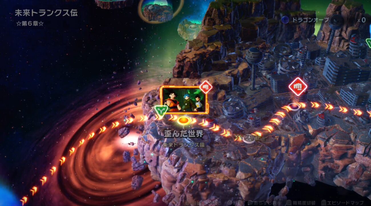 | 懐かしき親子修行 | 未来トランクスが過去のベジータと修行する導入ステージ | 分岐なし。クリアで次の「歪んだ世界」へ |