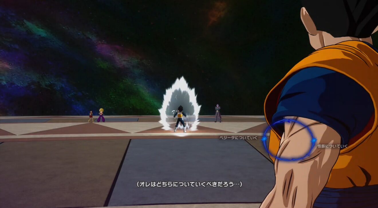 | ステップ3 | 会話「父かチームワークか」 | 「悟飯についていく」を選択 | 「ベジータについていく」を選ぶと「受け継ぐ誇り」ルートになる |
