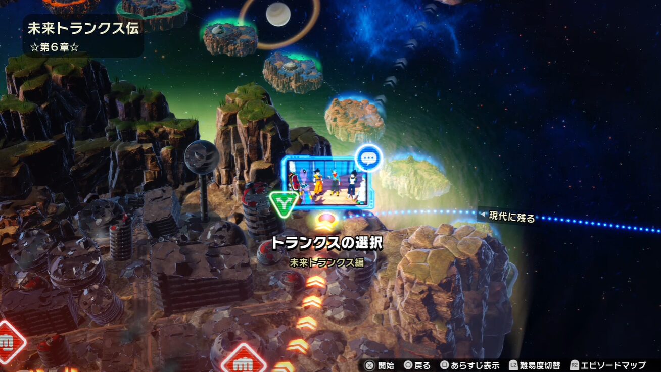 まず押さえておきたいのは、「踏み出す明日へ」はエピソードバトルのうち、未来トランクス伝(第6章)を進めることで解放されるIFルートだという点です。物語の進行そのものは通常ルートと同じチャプター構成で進みますが、途中の選択肢と、一部バトルのクリア内容によって「IFルートに進むかどうか」が決まります。特定の条件を満たしていないと、そもそもルート選択の会話イベント自体が現れないため、事前にルールを知っておくことが重要です。