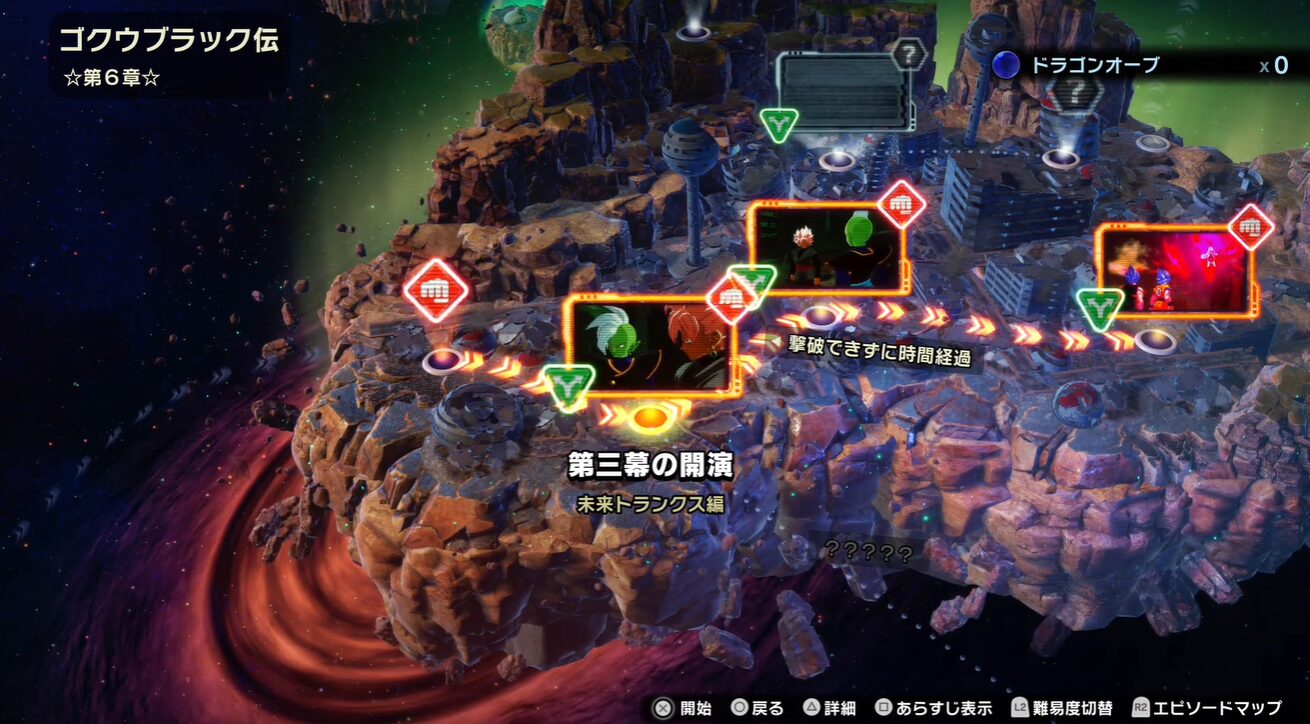 次に、ゴクウブラック伝を最初から順番にプレイし、第6章が解放されるところまで進めておく必要があります。エピソードバトルでは、途中の章やSparking!エピソードだけを個別に選ぶことはできず、原則として上から順番にストーリーを追っていく形になるため、「途中のエピソードを飛ばしていたせいで第6章自体が出ていなかった」というケースも少なくありません。