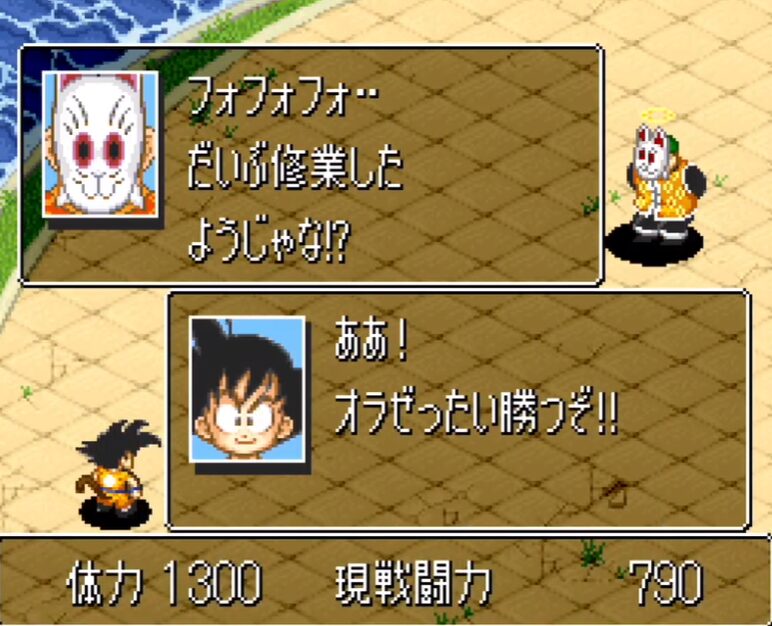 170亀仙人と鶴仙人の悪口合戦第22回天下一武道会の会場で、亀仙人と鶴仙人が互いの悪口を言い合うイベント。会話イベントだが、悟空たちの前で両流派の因縁がはっきり示され、以後の天津飯の心情変化にもつながる。バトルなし(戦闘力・体力UP、逆かめはめ波を覚えるフラグ扱いにしてもOK)CH37:第22回天下一武道会と天津飯の登場JC10巻 第22回天下一武道会導入シーン