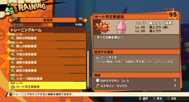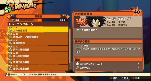- トレーニングは複数のレベルに分かれており、それぞれ特定の課題があります。例えば、レベル1の「力の暴走」では、ラディッツ、ナッパ、栽培マンと戦います。