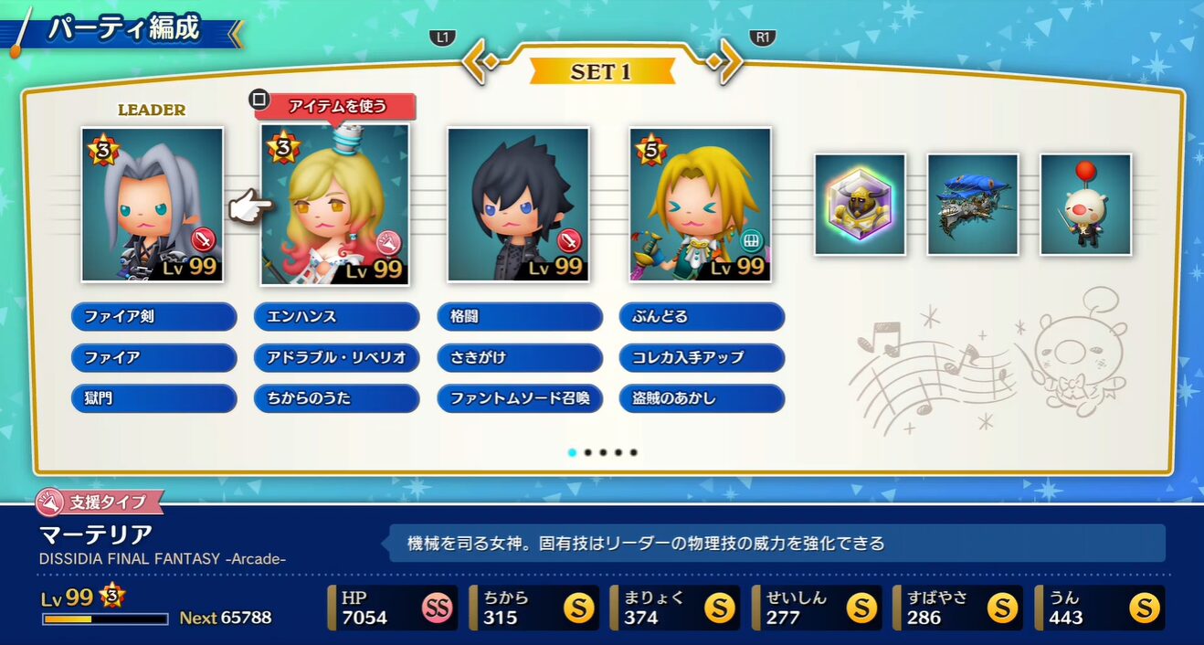 2枠目にはマーテリア(Lv99)を置き、「エンハンス」「アドラブル・リベリオ」「ちからのうた」などのバフ系アビリティで全体を強化します。短い曲の総ダメージ条件を支援で底上げするという意味で、このポジションにマーテリアが入っているのは非常に理にかなっており、セフィロスやノクティスのような火力枠の働きを最大限に伸ばす役割を担っています。