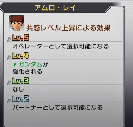 『ガンダム無双3』における「共感」は、各キャラクターとプレイヤーとの関係性を5段階で表現するシステムです。前作までの「キャラ同士の友好度」とは異なり、プレイヤー自身と個々のパイロットとの“信頼の深さ”がテーマとなっています。