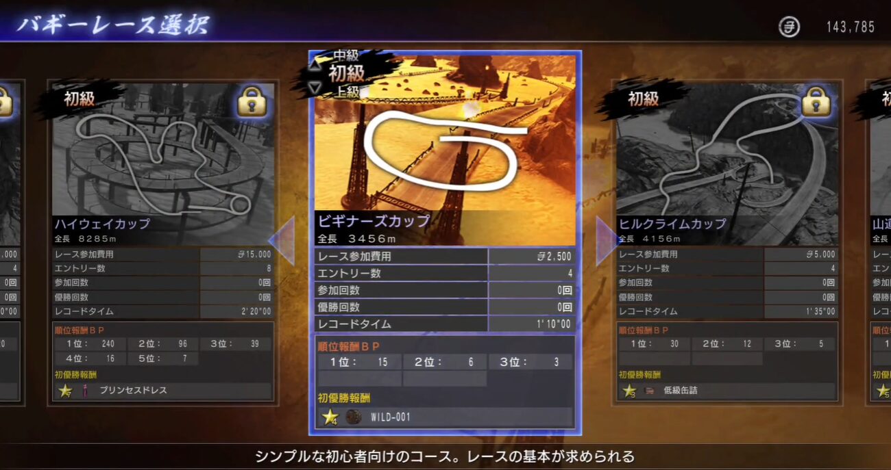 まずエデンでバットに話してレースに参加し、ビギナーズカップ(初級)で優勝してタイヤ(WILD-001)を獲得します。