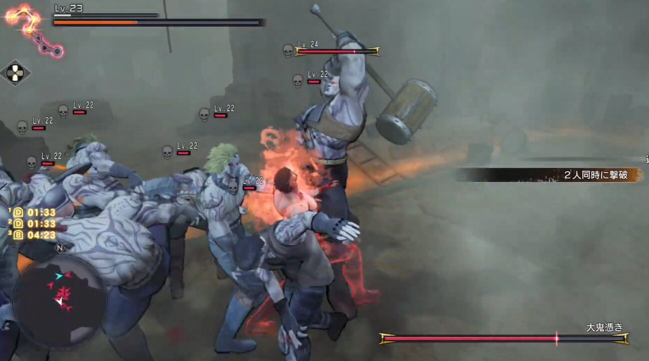 鬼憑き村に入ると、到着直後から複数回の戦闘が続きます。集団戦で一番まずいのは、攻撃を欲張って囲まれ、短時間で体力を削られる展開です。基本は「位置取りを整える→相手をばらけさせる→孤立した相手から落とす」という順番で、密集を作らないように立ち回ります。
