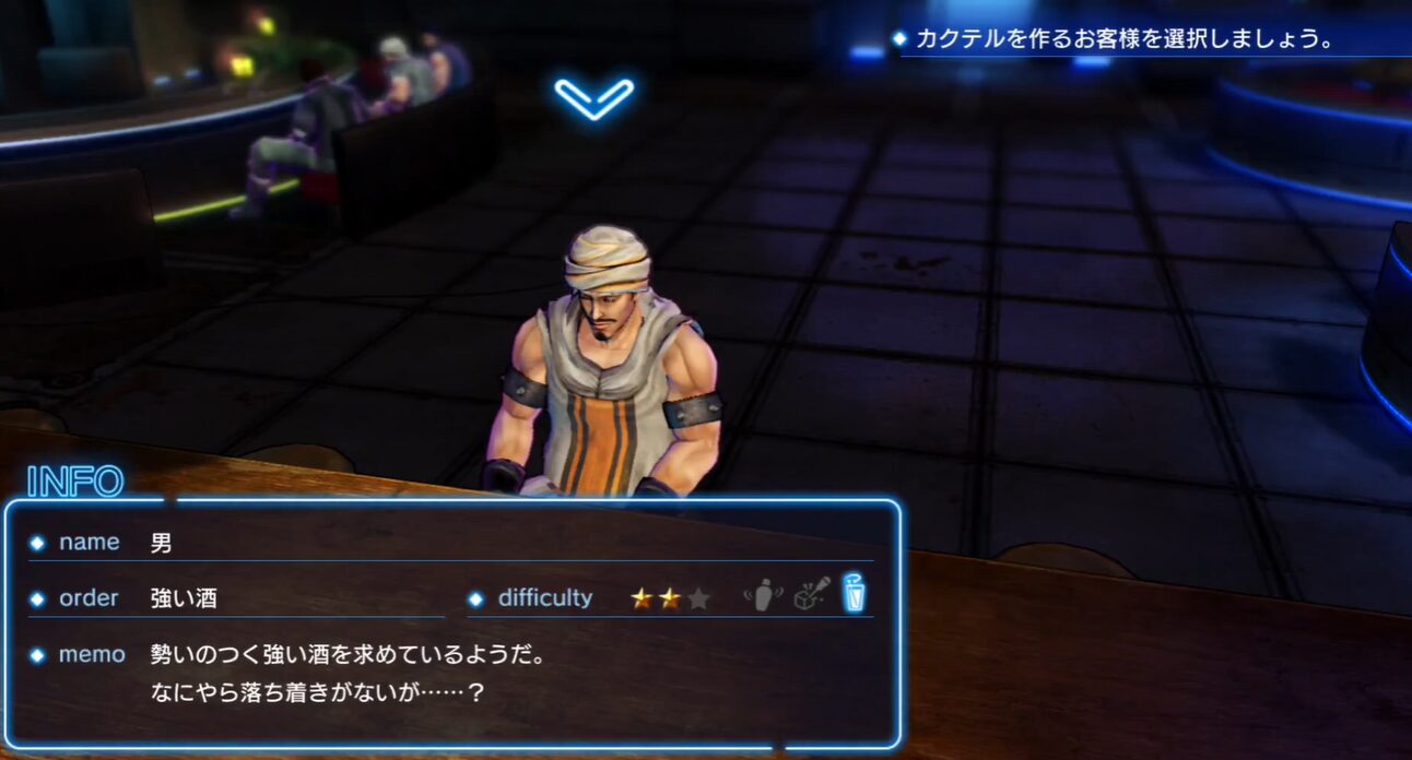 | 1 | バー「ラスティネイル」でバーテンダー・ケンを遊ぶ | 客として「タイラ」が来店した際に、注文どおりにカクテルを作って成功させます。成功後に会話イベントが続き、ミッションが発生します。 |
