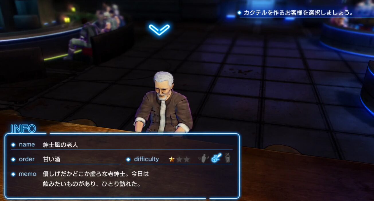 | 発生条件 | バーテンダー・ケンで「紳士風の老人」の注文を受ける | カクテル作成に成功すると進行 |