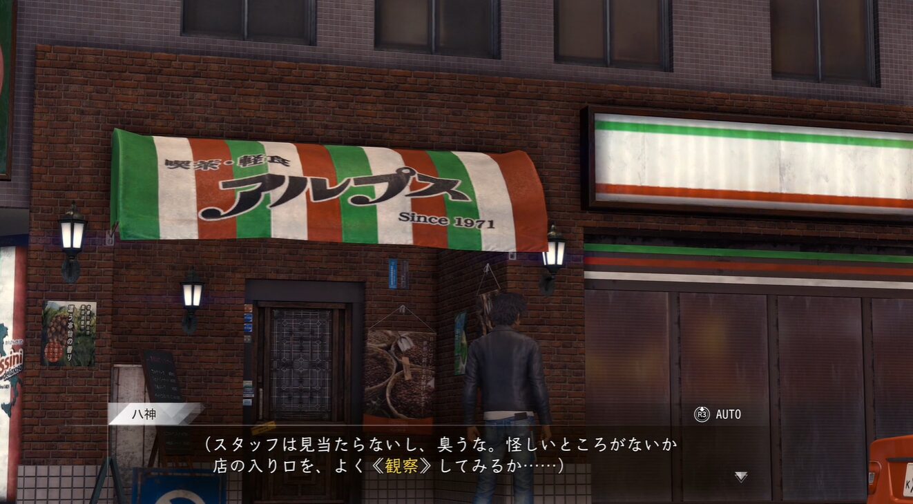『LOST JUDGMENT:裁かれざる記憶』のサイドケース「強盗はCafeにいる」は、神室町・天下一通りで発生する調査系の依頼です。3章以降にロマンスカフェ付近へ近づくことで始まり、バズリサーチャーを使った聞き込み、喫茶アルプスでの観察モード、ピッキング、ダンボールを使った接近、そして最後のチェイスまで、短めながらも流れに変化のある内容になっています。