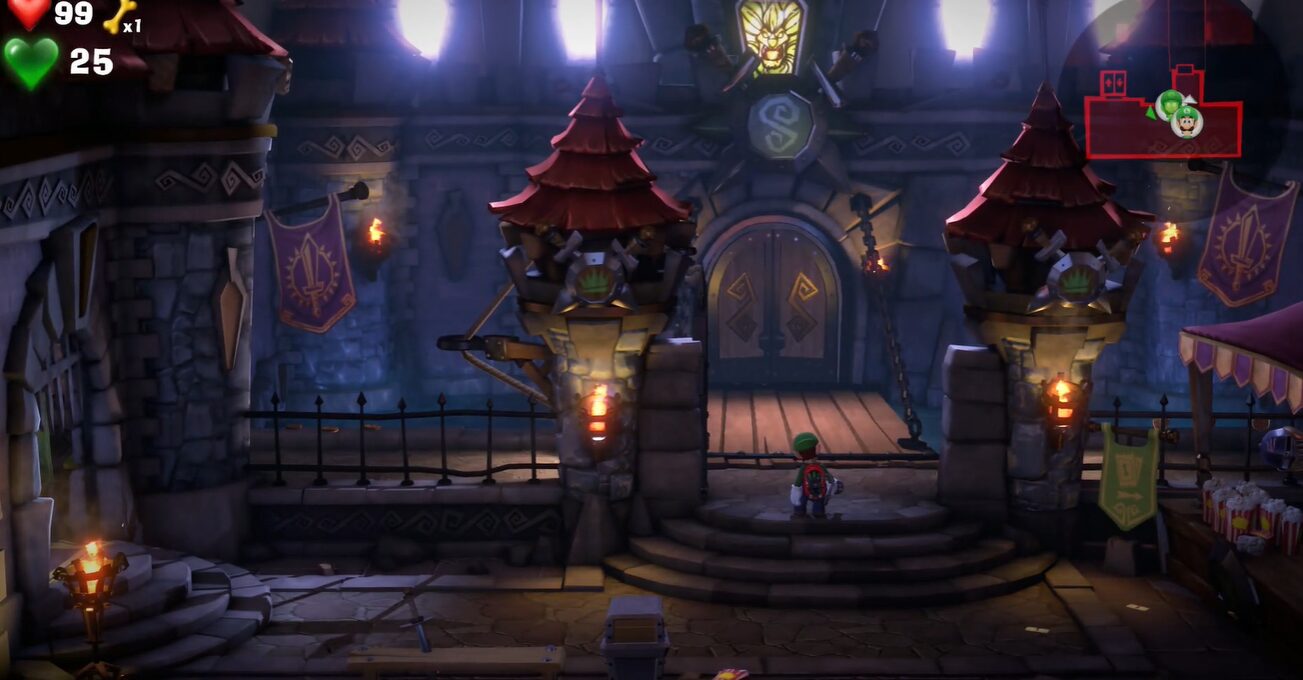 - グーイージでトゲを突破:階段を下る際、トゲのトラップに注意。グーイージを使ってトラップを解除し、宝箱を開けましょう。下に降りるとさらにトゲのトラップがあり、グーイージで鉄球を引っ張り、ルイージも通れるようにします。