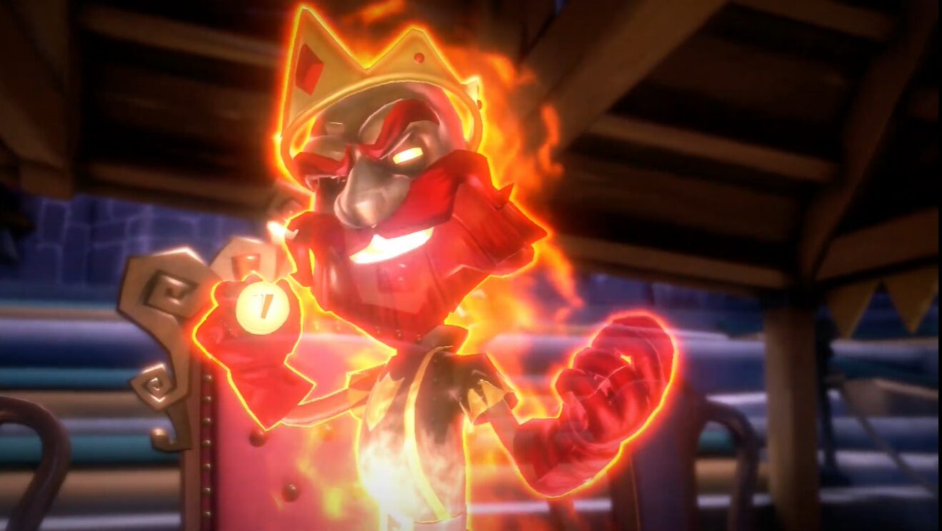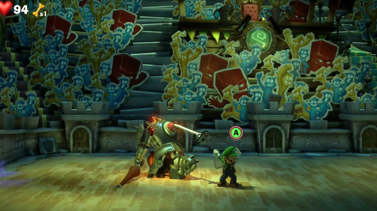- ボスの攻撃を避ける:ブリキの馬に乗ったホリーボーテ三世が突進してくるので、突進してくる最中にタイミングよくストロボを当て、キューバンショットで叩きつけてダメージを与えます。9回叩きつけると鎧が壊れます。