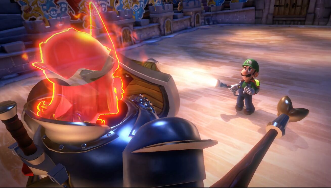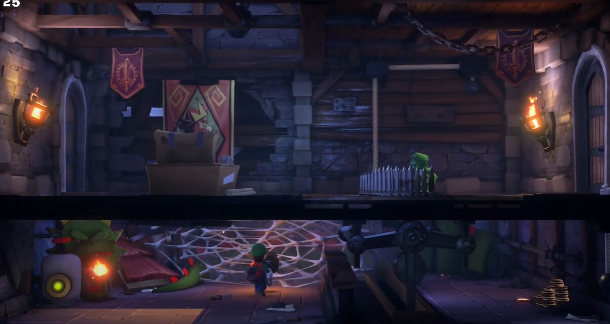 - 準備室で仕掛けを解く:グーイージを使って鉄球を引っ張り、左下の鉄球をルイージで引っ張るとクモの巣に移動。スイッチにストロボをすると火が点くので、トーチを吸い込みクモの巣を燃やして右奥へ。右奥にある重りを吸い込みハシゴを出現させる。