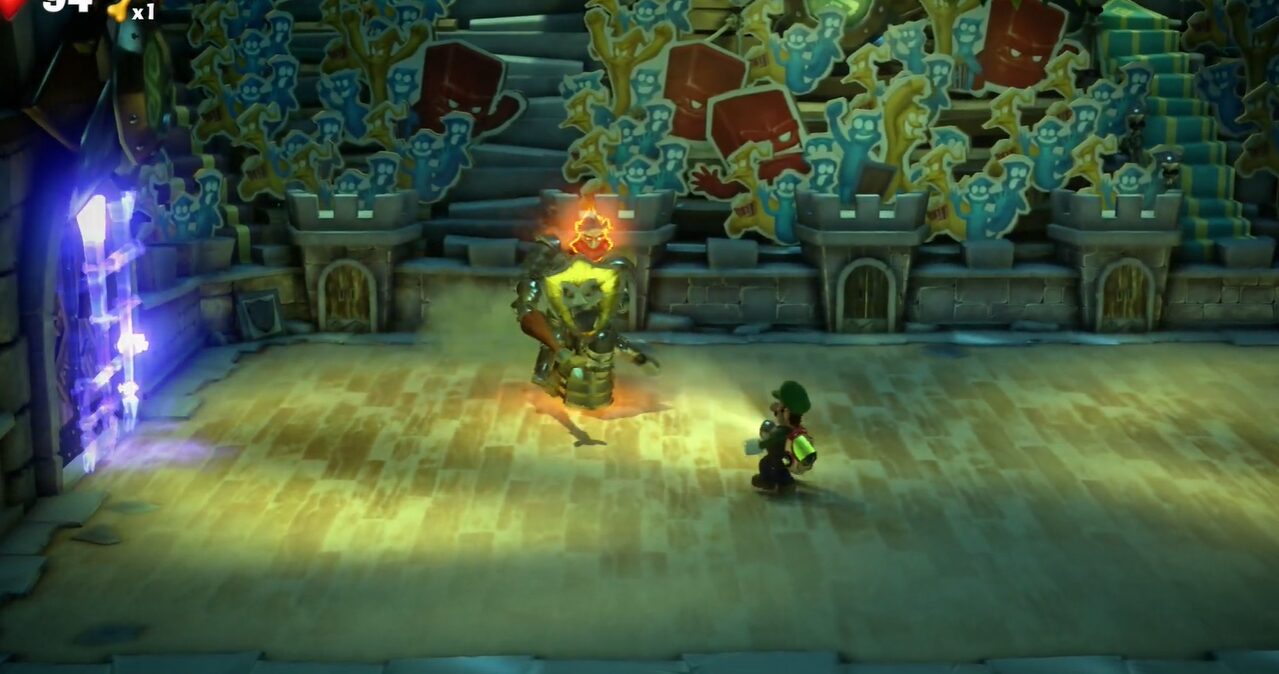 - エレベーターを降りたら:右に進んで部屋を出ます。ちなみに、暖炉の横にある鎧の頭を吸い込んで、ZLでぶつけると壊すことができ、金塊や金のオバケが出現します。