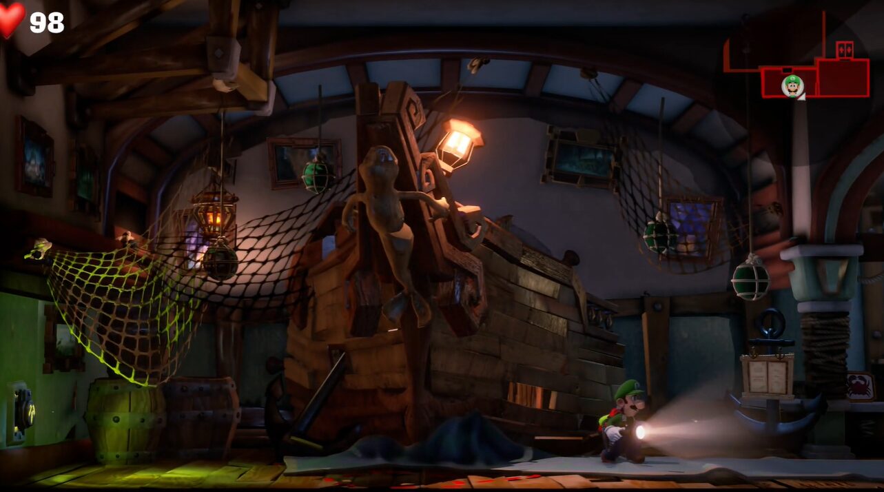 - エレベーターホールで、ゴミ箱に潜むオバケを倒します。キューバンショットでひっくり返し、ダークライトで呪い玉を吸い込むと倒せます。