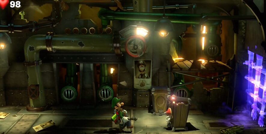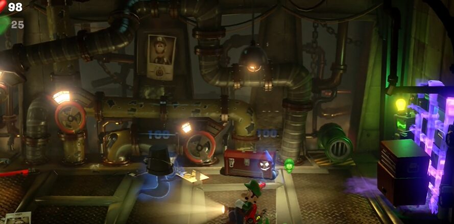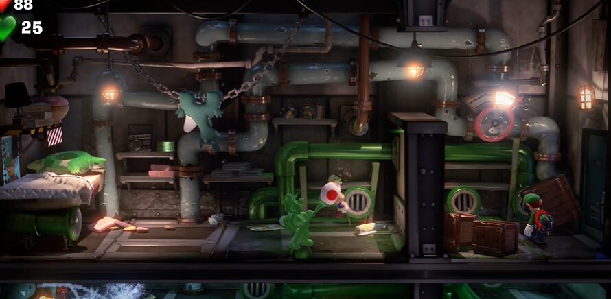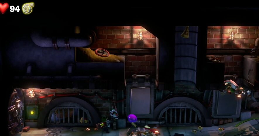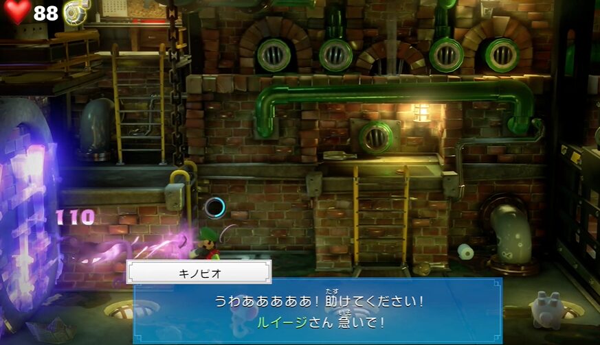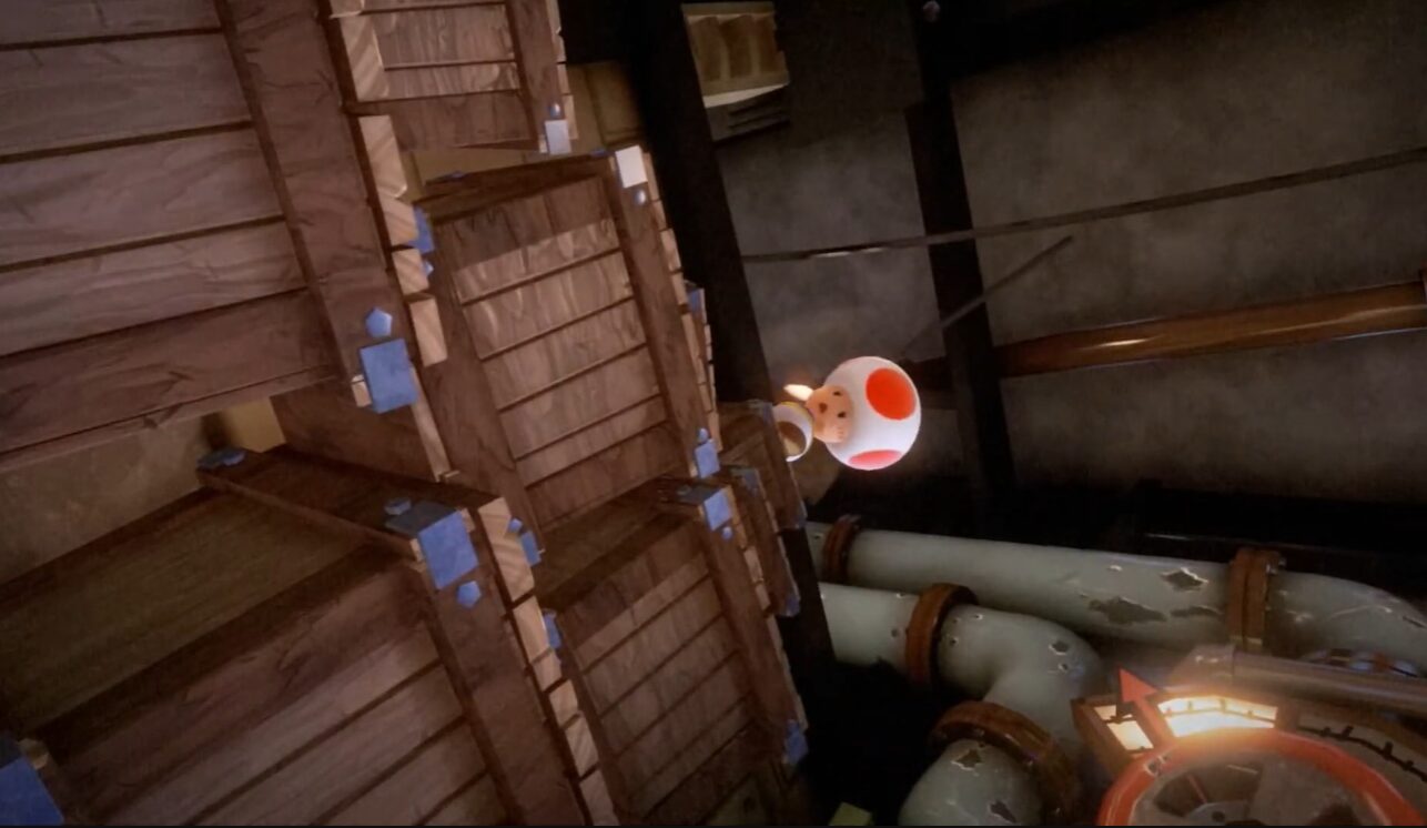 - グーイージで左側の配管に入り、ルイージでバルブのハンドルを操作し水を止めた後、ダンボールをバーストで吹き飛ばすと、キノピオを発見。