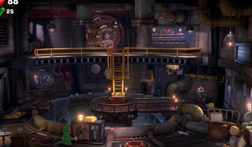 - ハシゴを降り、キノピオでレンガの壁を壊し、更にキノピオを右奥のギミックの上に乗る。ルイージはもう一つのギミックに乗ると回転装置が現れるので、回転装置を使ってL字通路を動かし、2階の南のドアから出るように回転させてあげる。