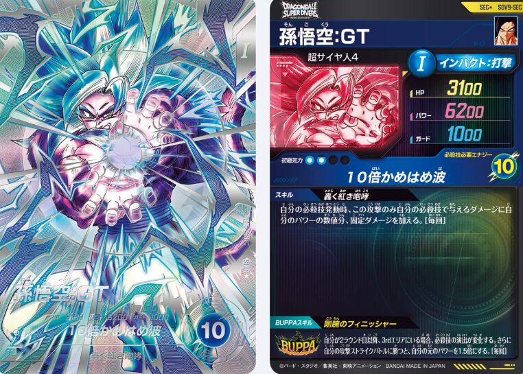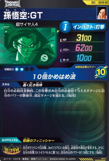 SDV9-SEC(孫悟空:GT)は、『ドラゴンボールスーパーダイバーズ』第9弾に収録されたSECカードです。特徴は、必殺技発動時に自分のパワー数値分の固定ダメージを加えられる点にあり、高いパワーと「10倍かめはめ波」を軸に大ダメージを狙いやすい1枚です。通常攻撃で細かく削るというより、必殺技を通した場面で一気に勝負を決めにいくフィニッシャー寄りのカードとして見ていけます。