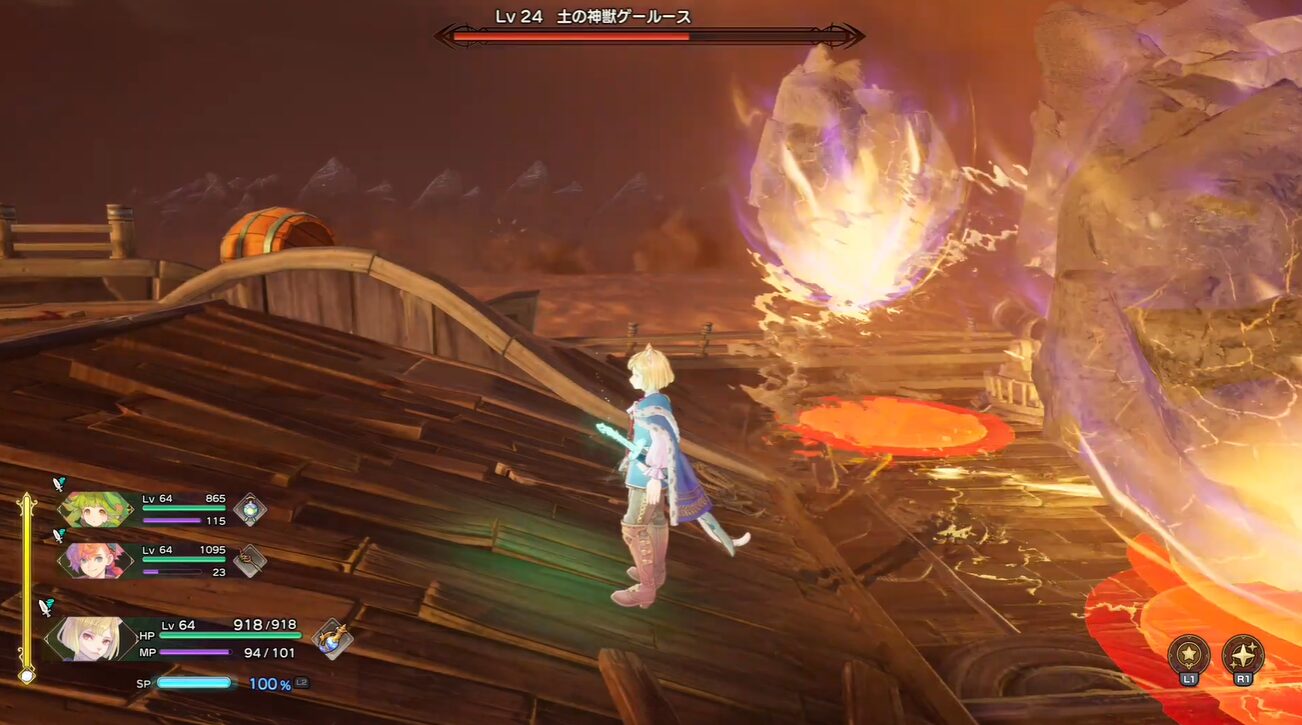 ゲールースは岩石を飛ばしてくる攻撃を行います。この攻撃は足元に赤い円が表示され、回避のタイミングが分かりやすいため、素早く円の外に移動して避けましょう。大砲を使って攻撃する際も、この攻撃に注意し、大砲の操作を中断して回避することが重要です。
