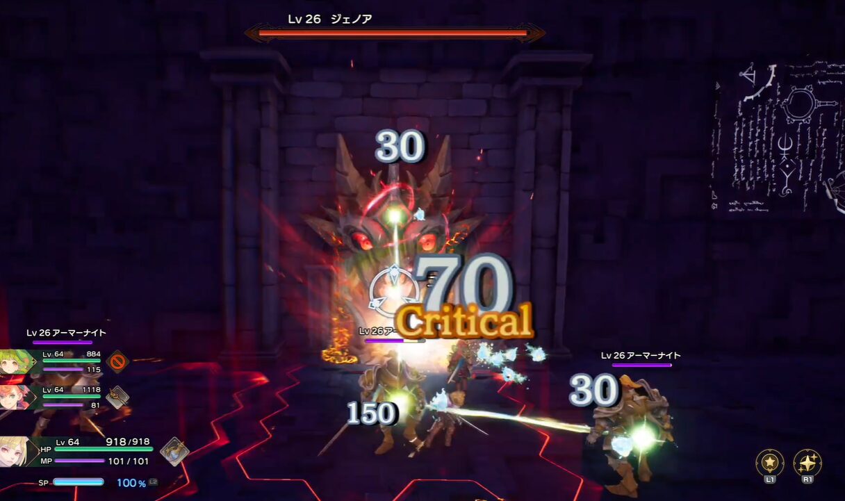 ゼーブル・ファーの戦闘は3つの顔が順番に登場します。左右にある顔を倒すと、中央の顔が出現します。この中央の顔が本体であり、左右の顔を倒してから集中攻撃を加える必要があります。攻撃パターンが複雑で、特に長期戦になるため、MPの管理が鍵となります。