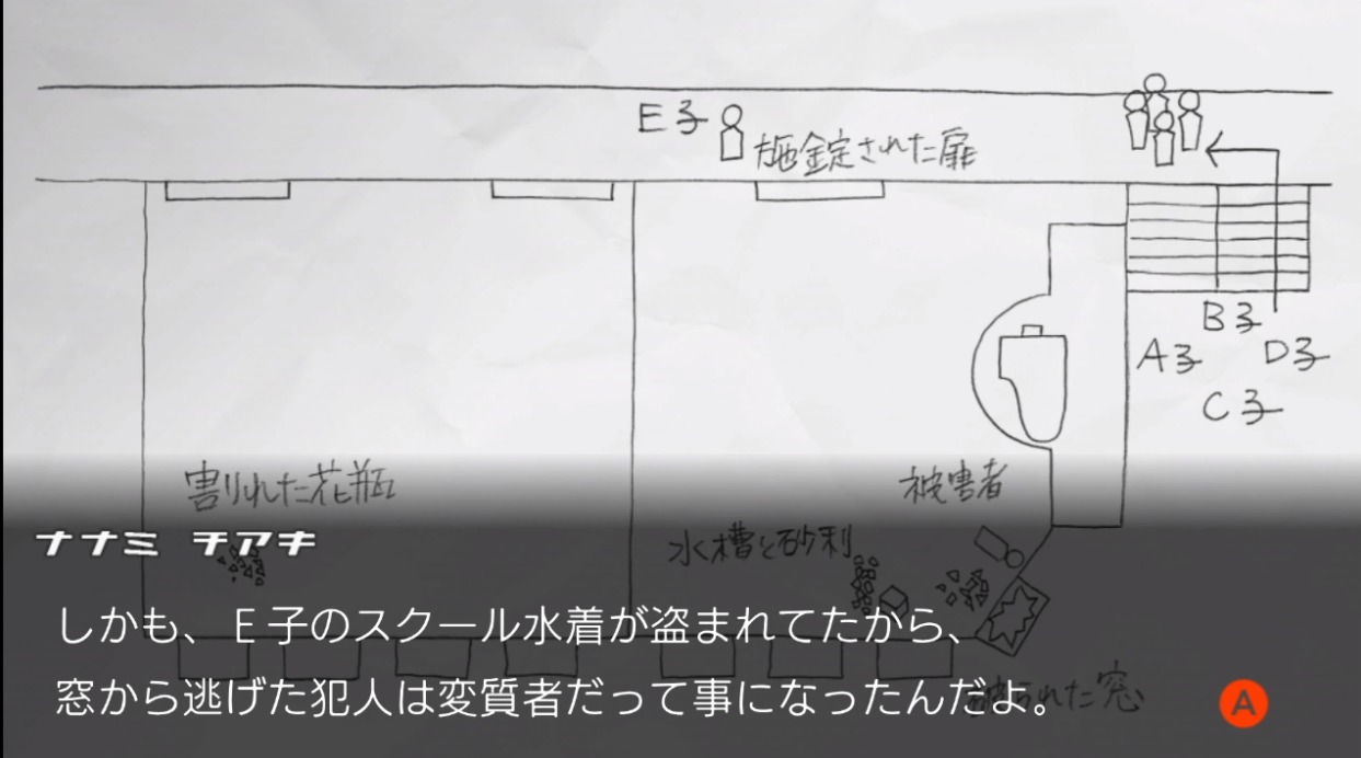 - 言弾「散乱した水槽」「犯人の逃走経路」「盗まれた水着」