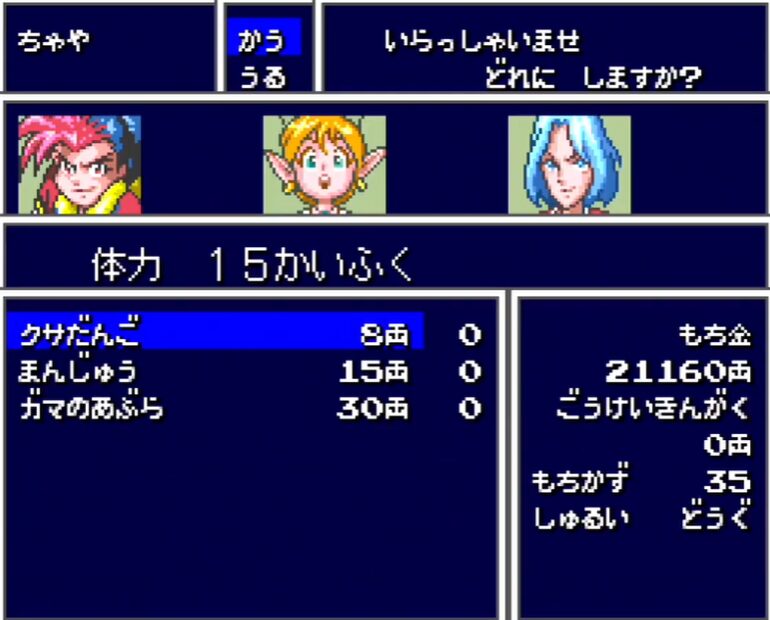 | 道具屋 | まんじゅう | 15両 | 15両 | 15両 | 最低限の回復・補給 | — |
