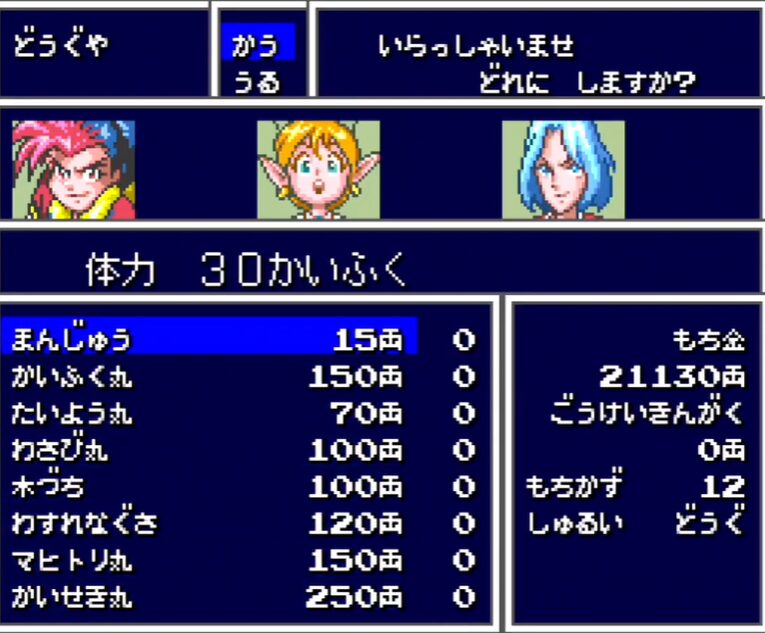 | 道具屋(通常) | かいふく丸 | 150両 | 樹海を抜ける前に在庫を整える | いつでも |