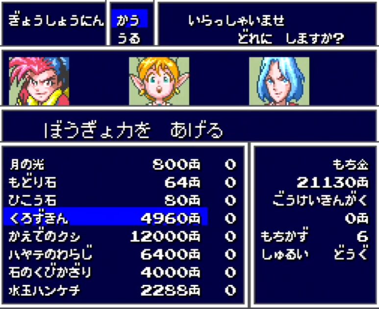 | 行商人 | かいふく丸 | 120両 | 足りない時の補充 | 次の国の探索前に最低限確保 |