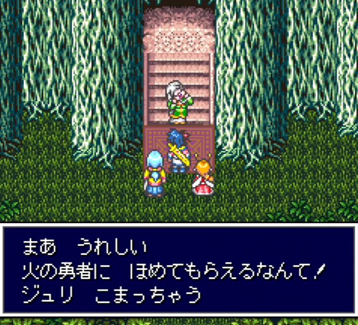 | 5 | 青池村 | 西側から入村→初回ジュリイベント進行→会話・情報を拾う | 村内の回収(星の光、かいふく丸、500両など)/武具屋で装備更新を検討 | 東側は木で塞がれて入れない。怪樹城前の最後の更新ポイントになりやすい |