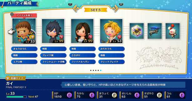 次のステップとして、格闘とついかぎりを組み合わせた“高回数狙いパーティ”があります。ノクティスやティファが格闘+バフ+固有技を担当し、スコールやバッツがついかぎりを担当する形が定番です。