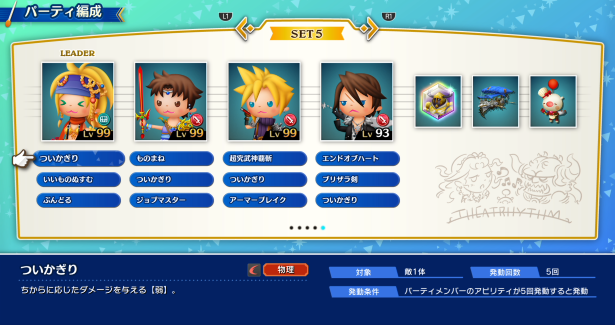 次に見落としがちなのが、「アビリティ枠をきちんと埋めていないキャラがいる」ケースです。シアトリズムFBLでは、4人×3スロット=最大12アビリティが同時に稼働できる仕様なので、1枠でも空いていると、その分だけ“発動の機会”を捨てていることになります。特にシリーズクエストの途中で仲間になったキャラをそのまま使うと、アビリティが1つも付いていないこともあるため、クエストに挑む前に一度全員のスロットを確認しておくと安心です。