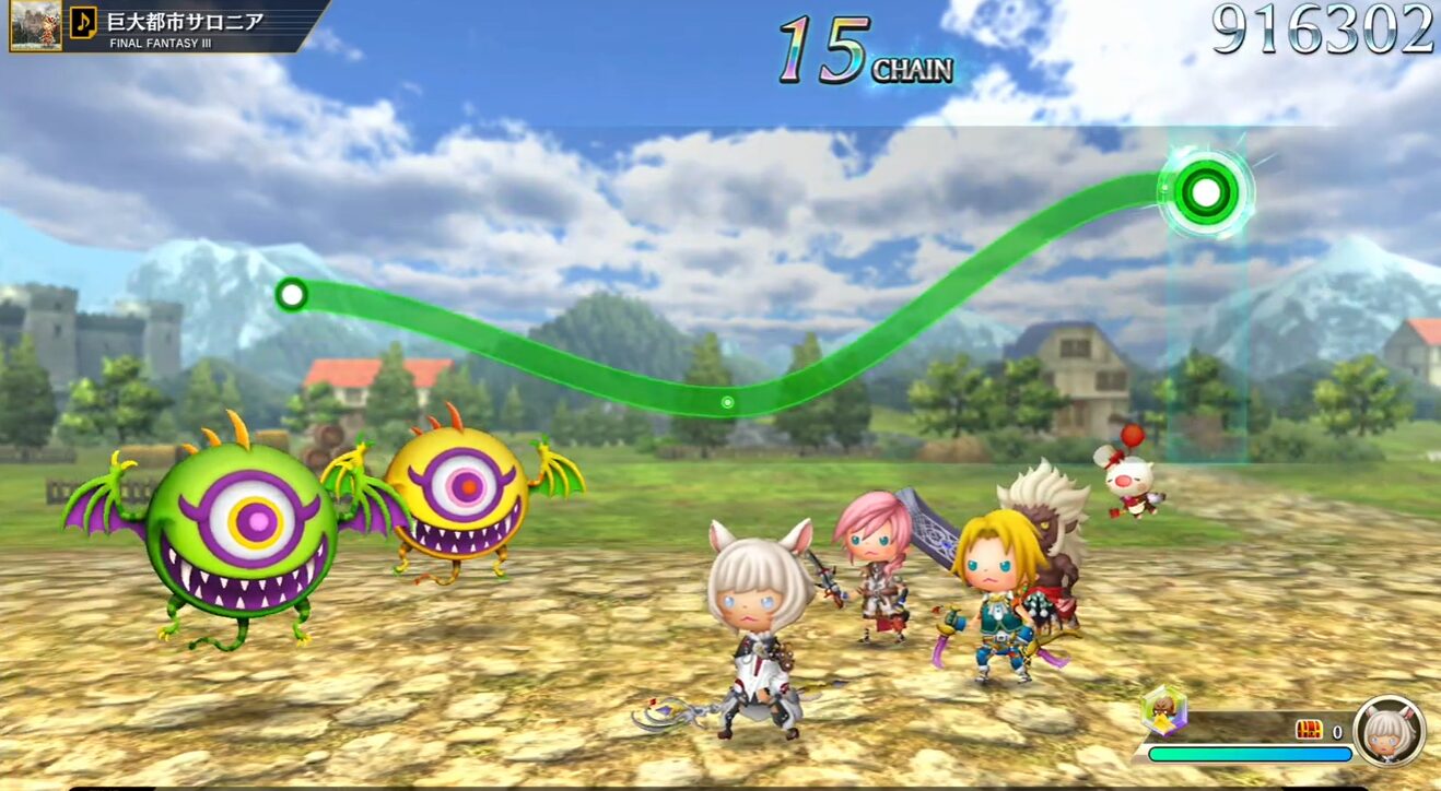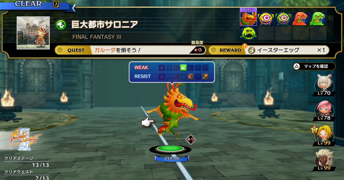 プレイ感としては、「あのサロニアをもう一度歩きながら、ガルーダ戦の緊張感も音ゲー形式で追体験する」ステージになっているため、FFⅢファンにとっては特に楽しいクエストのひとつと言えるでしょう。