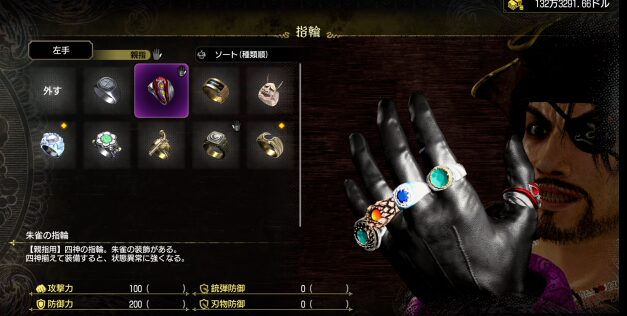『龍が如く8外伝 Pirates in Hawaii』において、指輪は主人公・真島吾朗が装備することで様々なボーナス効果を得られる重要なアイテムです。