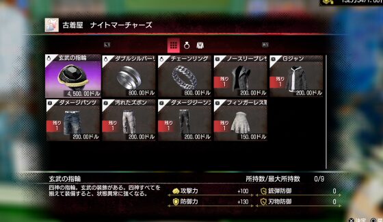 | 白虎の指輪 | 0 | 170 | 50 | 0 | 親指/人差し指/中指/薬指 | ・チャイナタウンの「中華武具 武術の館」で3500ドル ・サブストーリー9「最速・最強への道」クリア報酬(要「ハワイ最速の座」クリア) |