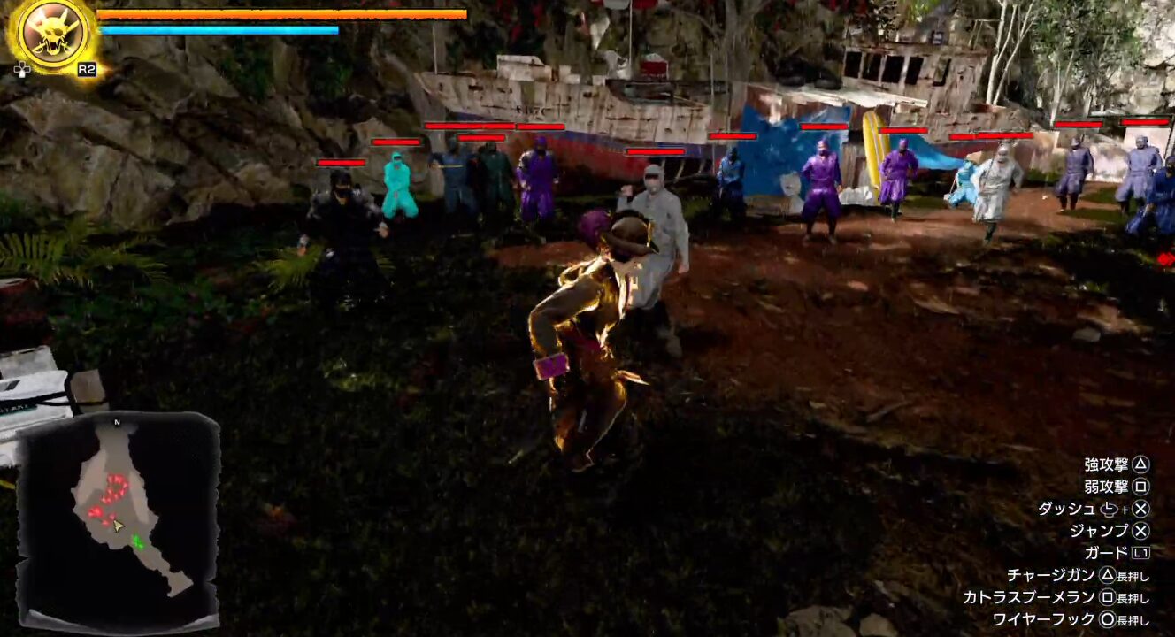 - 中ボス帯:海賊×5(マシンガン忍者混成):マシンガン装備の忍者が危険度トップ。射撃で隊列を崩される前に最優先で接近→ダウン→追い打ち。ボス格は必殺技を持つので、ゲージの溜まり具合に注意して割り込み回避を。
