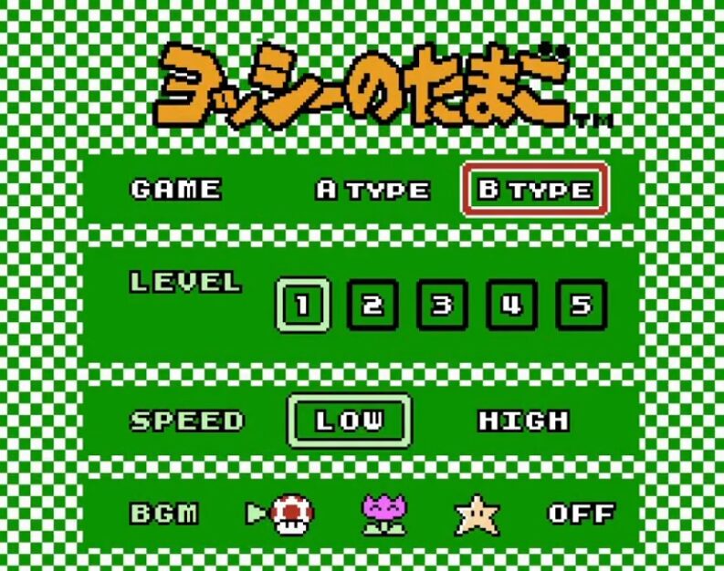 『ヨッシーのたまご』は、同じルールでも遊び方がはっきり分かれる3つのモードが用意されています。スコアをひたすら伸ばすAタイプ、手札(降ってくる組み合わせ)と盤面の噛み合いを見ながら“消し切り”を目指すBタイプ、そして相手への攻撃が絡む2人対戦です。どれも操作は同じですが、意識する優先順位が変わるため、先に「このモードは何を目指す遊びなのか」を押さえると、上達が早くなります。